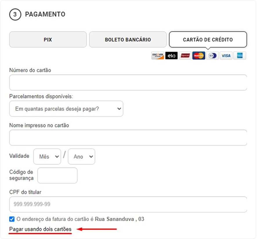Sim, é possível pagar com dois cartões! Na página de pagamento, selecione a opção “cartão de crédito” e depois clique em “pagar usando dois cartões”. Confira o exemplo na imagem abaixo.